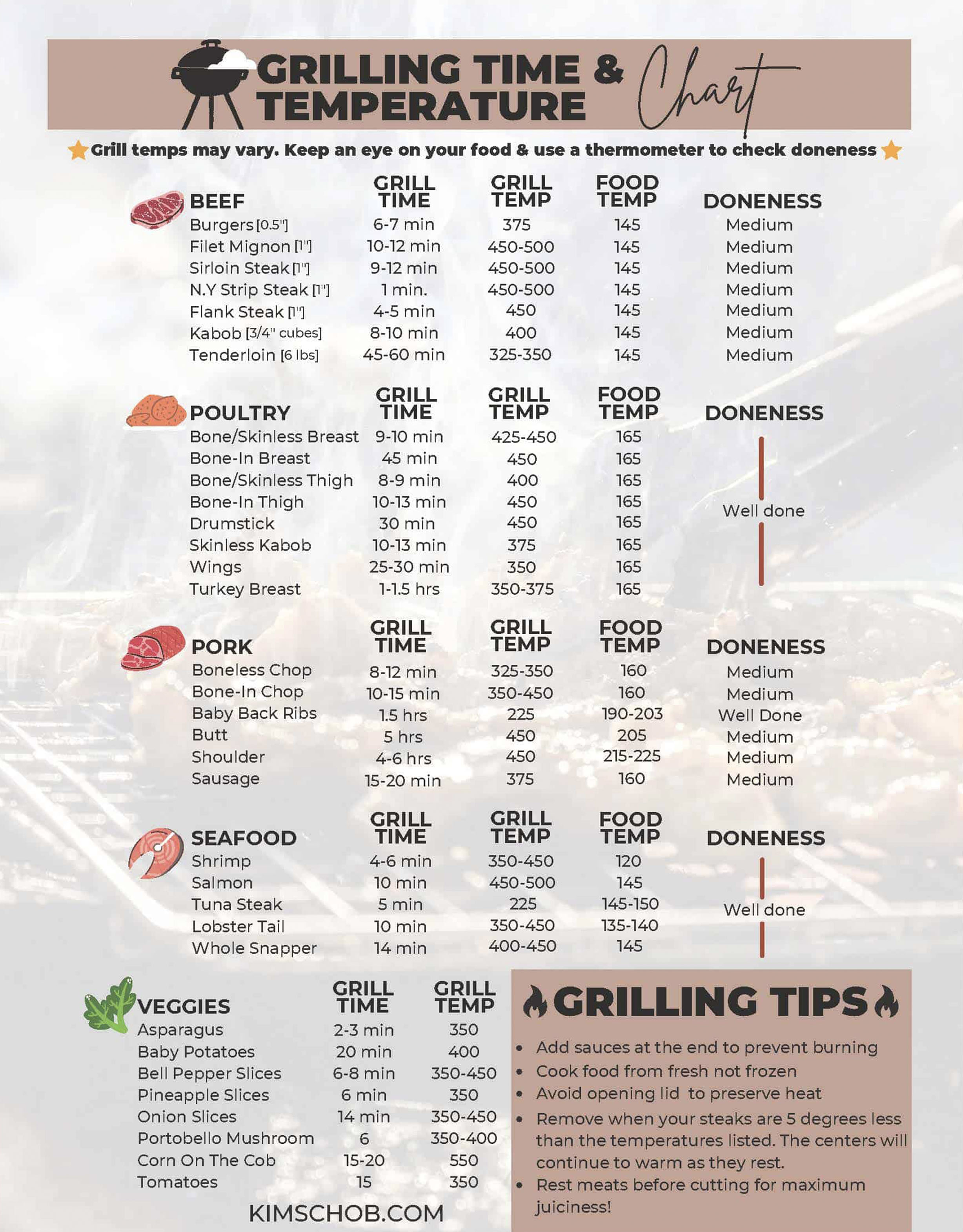 First off, know your basics. Below, you'll find my favorite temperature guide for grilling. It's important to know the grill temperature and time, as well as the internal meat temperature.